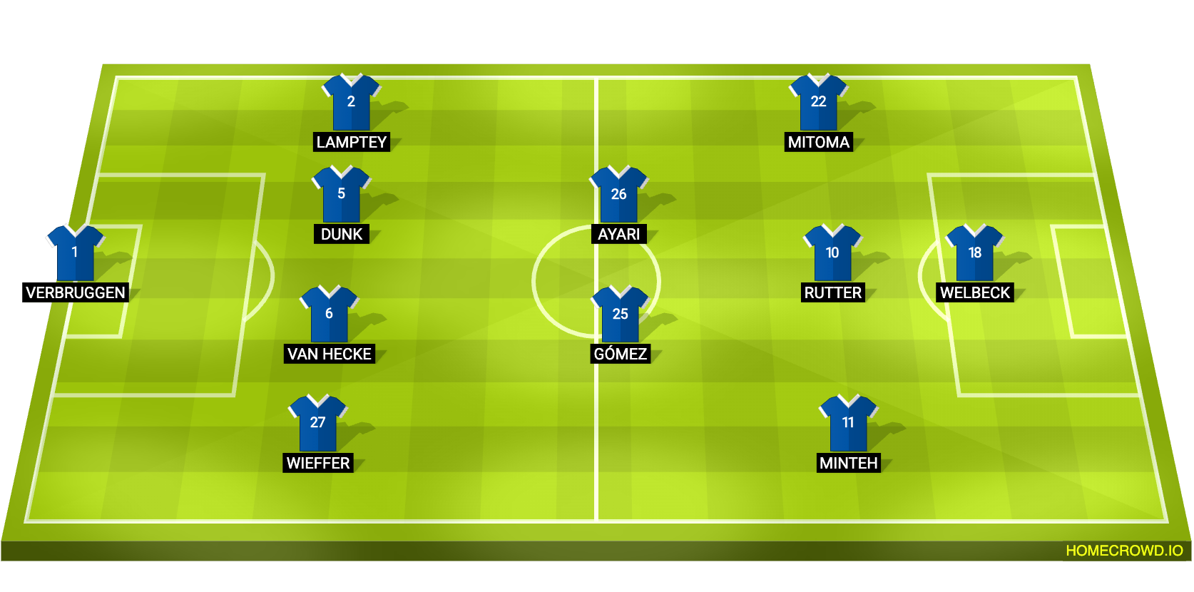 Probable Lineup (4-2-3-1): Verbruggen; Wieffer, van Hecke, Dunk, De Cuyper; Gomez, Ayari; Minteh, Rutter, Mitoma; Welbeck