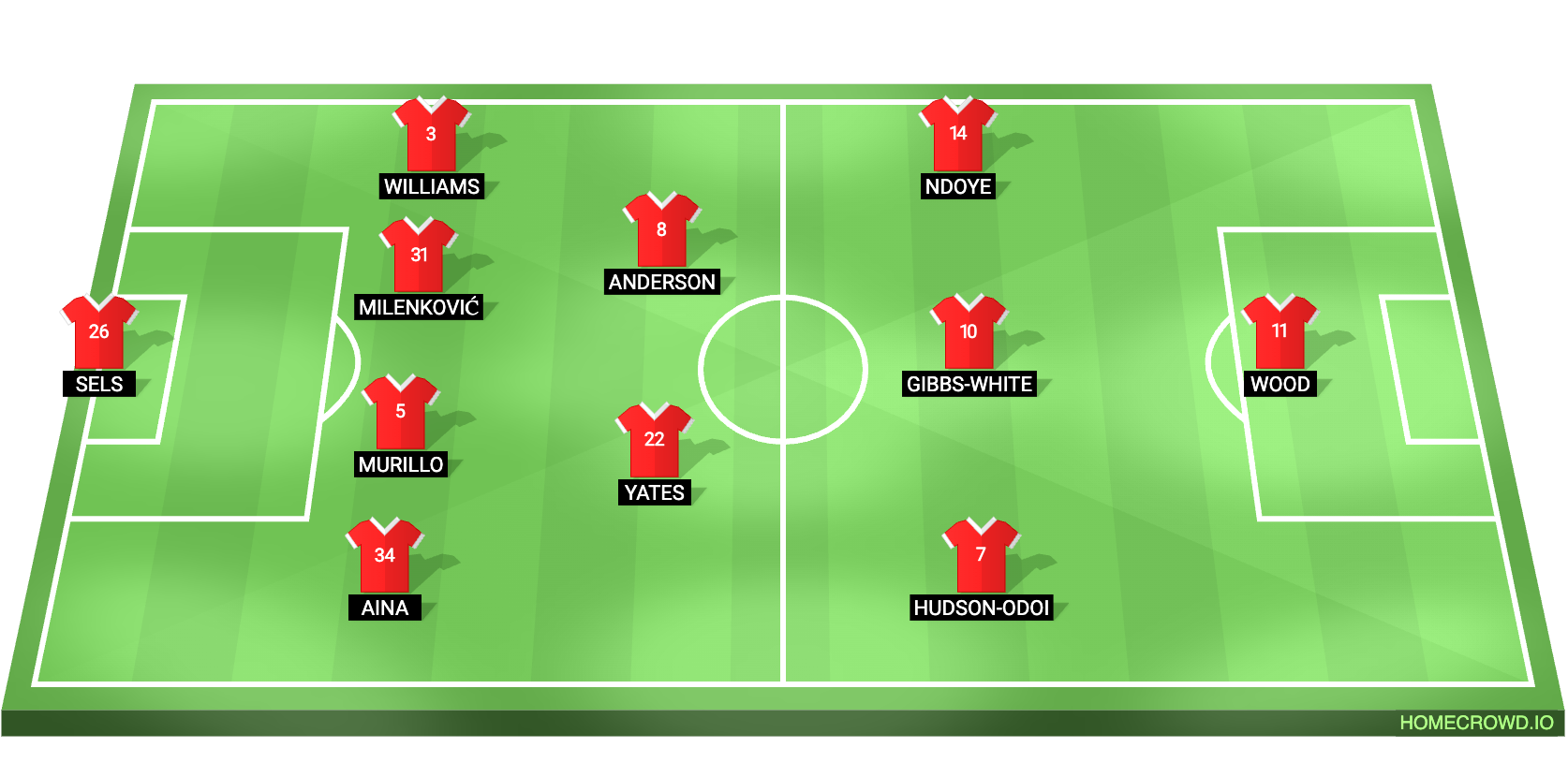 Probable Lineup (4-2-3-1): Sels; Aina, Milenkovic, Murillo, Williams; Yates, Anderson; Ndoye, Gibbs-White, Hudson-Odoi; Wood