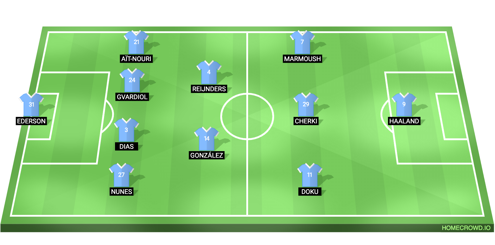 Jeremy Doku and Omar Marmoush will start on the flanks. They will look to add more cutting-edge in the final third and support Erling Haaland in the final third.