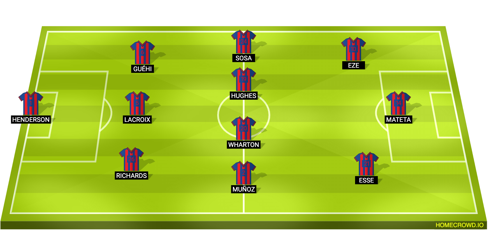 Probable Lineup (3-4-2-1): Henderson; Richards, Lacroix, Guehi; Munoz; Wharton, Hughes, Sosa; Esse, Eze; Mateta