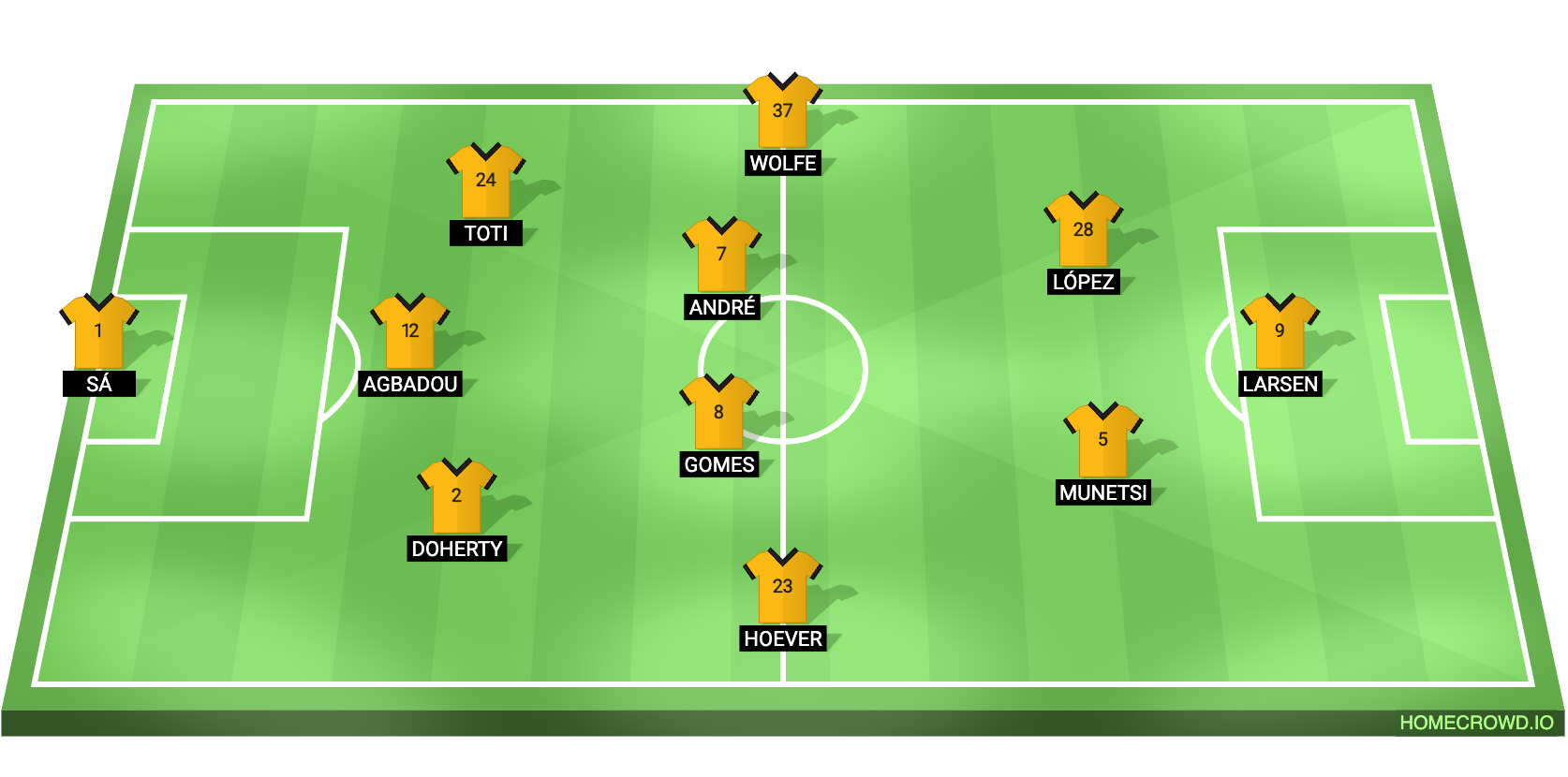 Probable Lineup (3-4-2-1): Sa; Doherty, Agbadou, Toti Gomes; Hoever, Joao Gomes, Andre, Wolfe; Lopez, Munetsi; Larsen