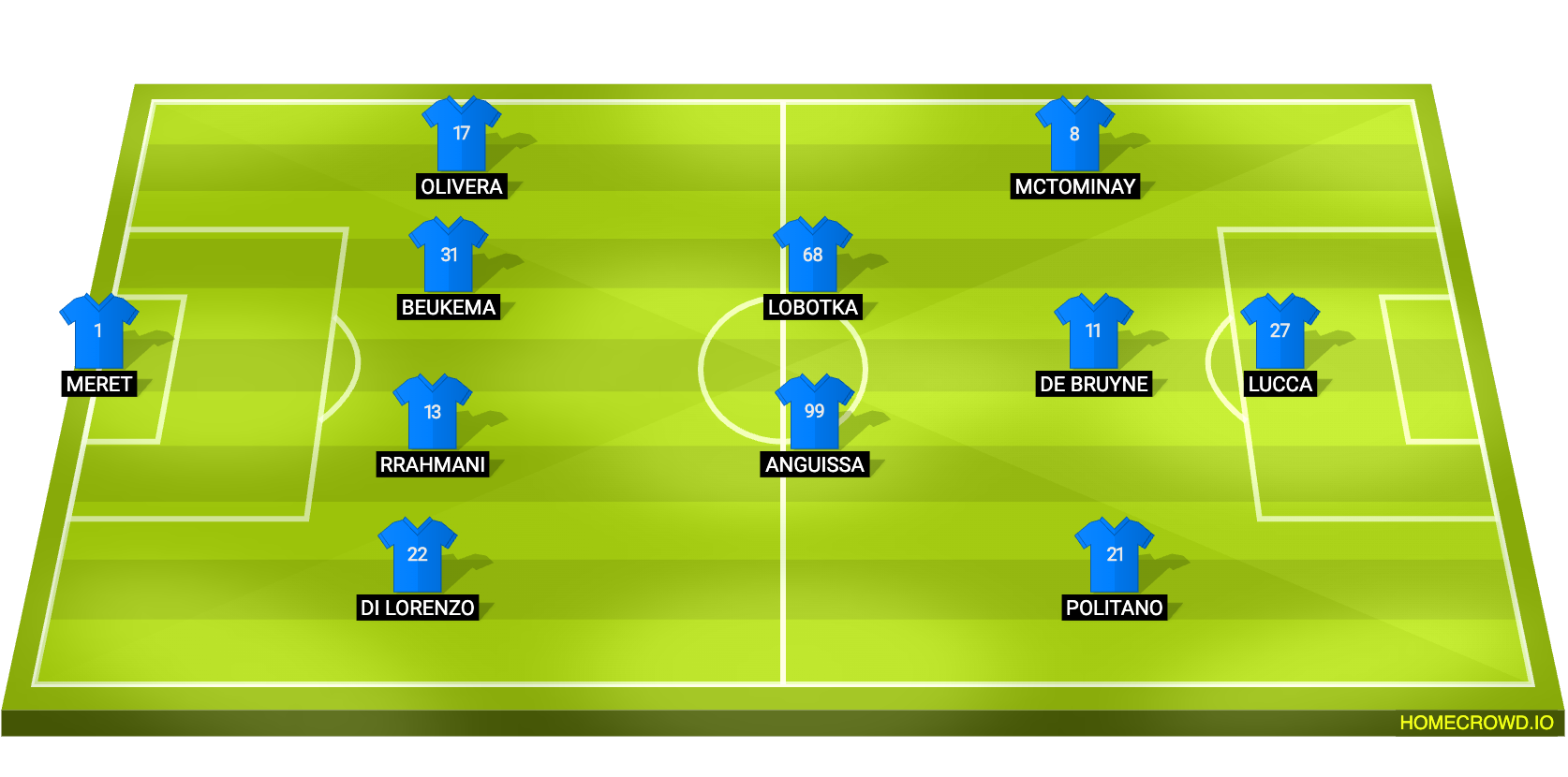Probable Lineup (4-2-3-1): Meret; Di Lorenzo, Rrahmani, Beukema, Olivera; Lobotka, Anguissa; Politano, De Bruyne, McTominay; Lucca