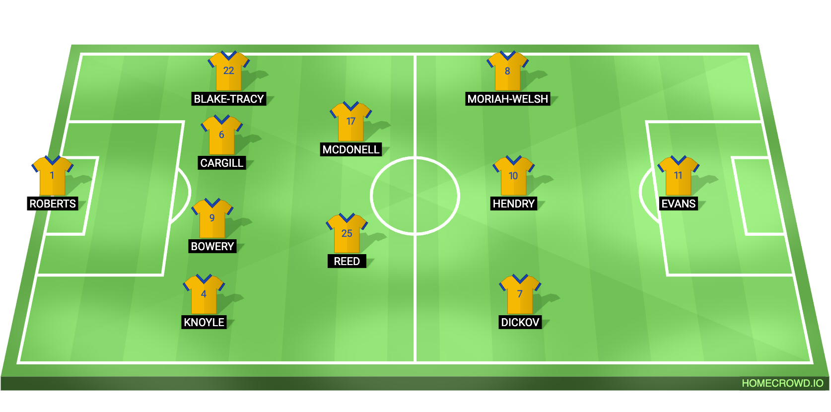 Probable Lineup (4-2-3-1): Roberts; Knoyle, Bowery, Cargill, Blake-Tracy; Reed, McDonell; Moriah-Welsh, Hendry, Dickov; Evans