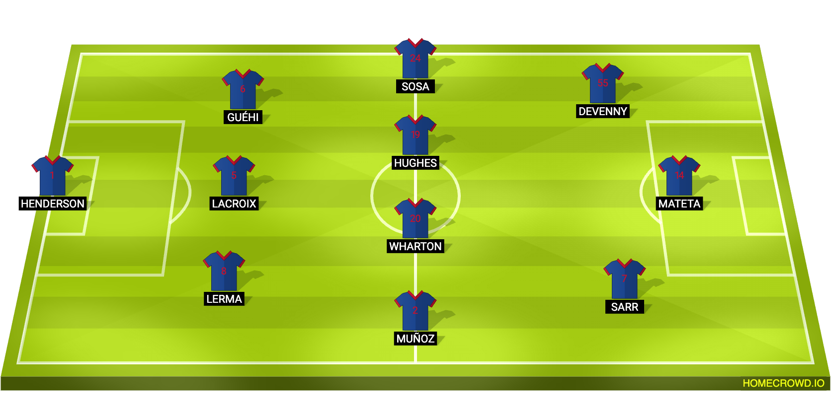 Probable Lineup (3-4-2-1): Henderson; Lerma, Lacroix, Guehi; Munoz, Wharton, Hughes, Sosa; Sarr, Devenny; Mateta