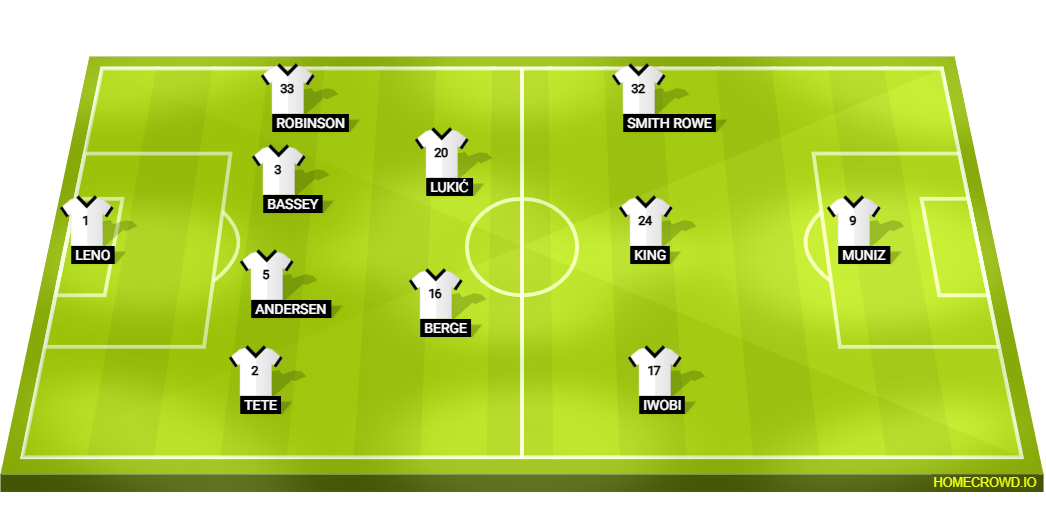 Probable Lineup (4-2-3-1): Leno; Tete, Andersen, Bassey, Robinson; Berge, Lukic; Iwobi, King, Smith Rowe; Muniz
