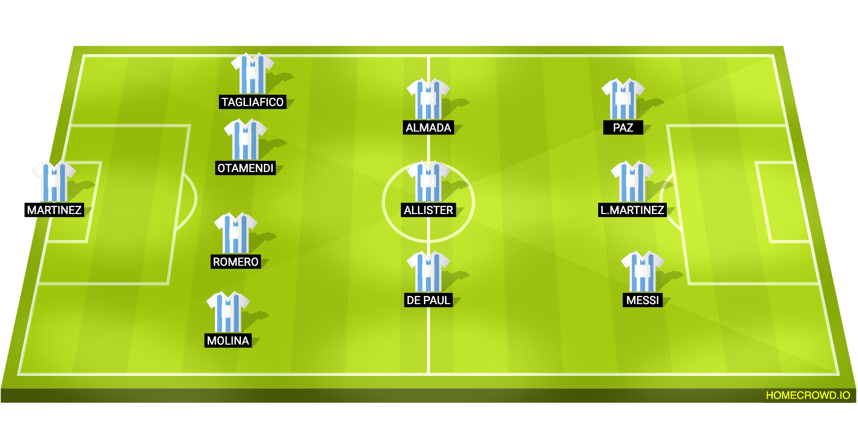 Probable Lineup (4-3-3): Emiliano Martinez; Molina, Romero, Otamendi, Tagliafico; De Paul, Mac Allister, Almada; Messi, Lautaro Martinez, Messi
