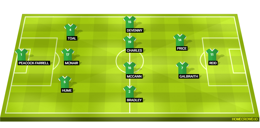 Probable Lineup (3-4-2-1): Peacock-Farrell; Hume, McNair, Toal; Bradley, McCann, Charles, Devenny; Galbraith, Price; Reid