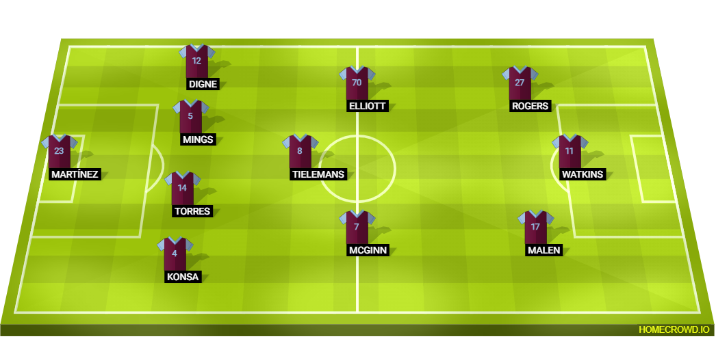 Probable Lineup (4-3-3): Martinez; Konsa, Pau Torres, Mings, Digne; McGinn, Tielemans, Elliott; Malen, Watkins, Rogers
