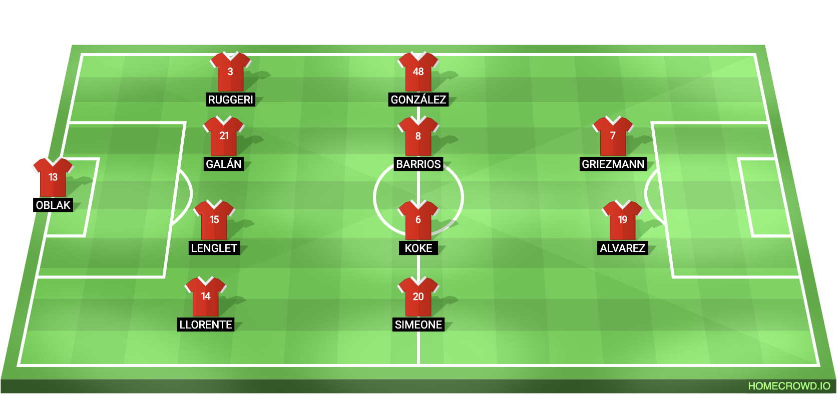 Probable Lineup (4-4-2): Oblak, Llorente, Lenglet, Galán, Ruggeri, De Paul, Barrios, Simeone, González, Álvarez, Griezmann