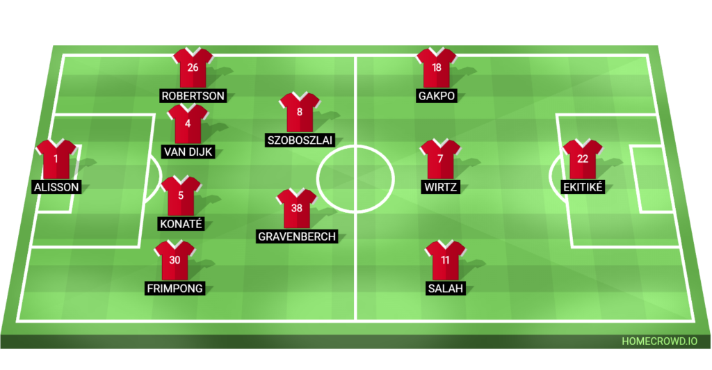 Probable Lineup (4-3-3): Becker, Frimpong, Konate, van Dijk, Robertson, Gravenberch, Szoboszlai, Salah, Wirtz, Gakpo; Ekitike