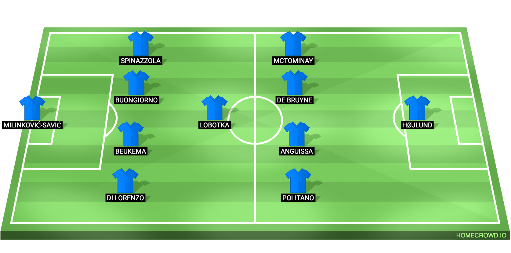 Probable Lineup (4-1-4-1): Milinkovic-Savic; Di Lorenzo, Beukema, Buongiorno, Spinazzola; Lobotka; Politano, Frank Anguissa, De Bruyne, McTominay; Højlund