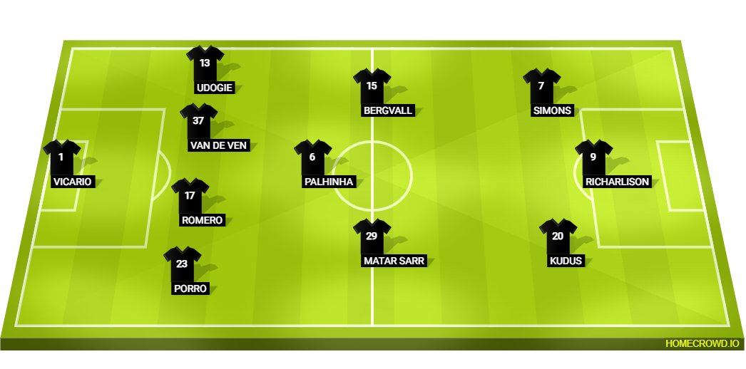 Probable Lineup (4-3-3): Vicario; Porro, Romero, van de Ven, Udogie; Sarr, Palhinha, Bergvall; Kudus, Richarlison, Simons