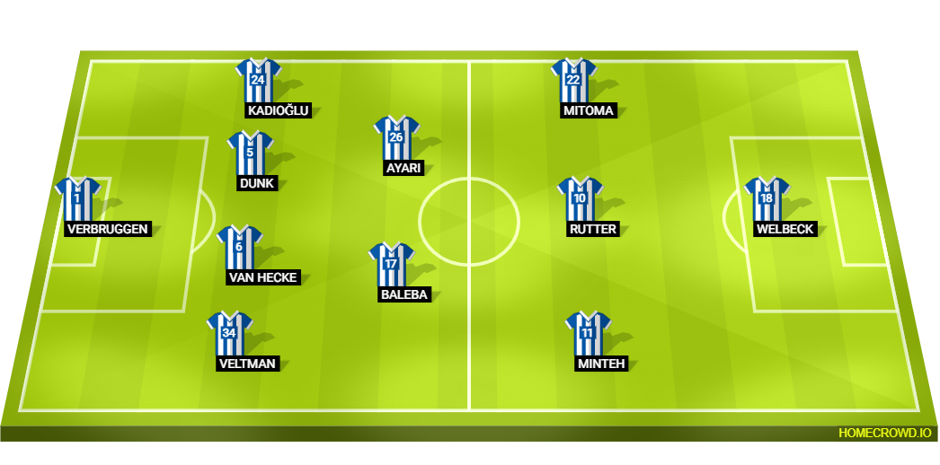 Probable Lineup (4-2-3-1): Verbruggen; Veltman, van Hecke, Dunk, Kadioglu; Baleba, Ayari; Minteh, Rutter, Mitoma; Welbeck