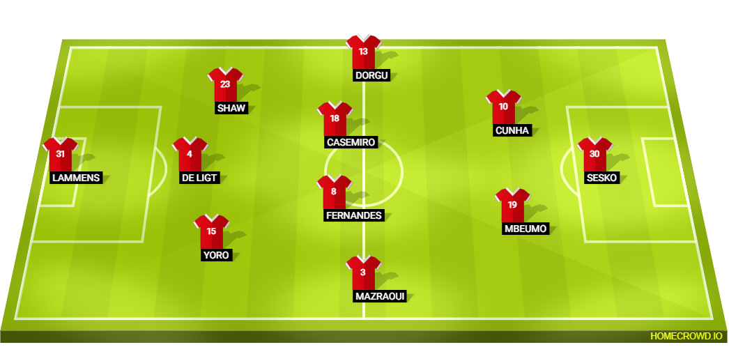 Probable Lineup (3-4-2-1): Lammens; Yoro, de Ligt, Shaw; Mazraoui, Bruno Fernandes, Casemiro, Dorgu; Mbeumo, Cunha; Sesko