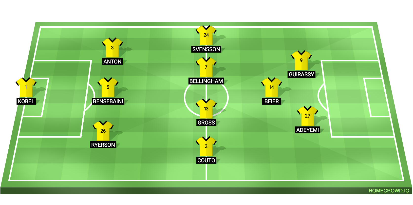 Probable Lineup (3-4-2-1): Kobel, Ryerson, Bensebaini, Anton, Couto, Svensson, Gross, Bellingham, Beier, Adeyemi, Guirassy
