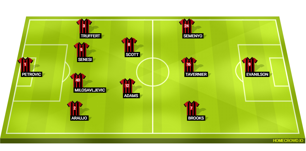 Probable Lineup (4-2-3-1): Petrovic; Hill, Milosavljevic, Senesi, Truffert; Adams, Scott; Brooks, Tavernier, Semenyo; Evanilson