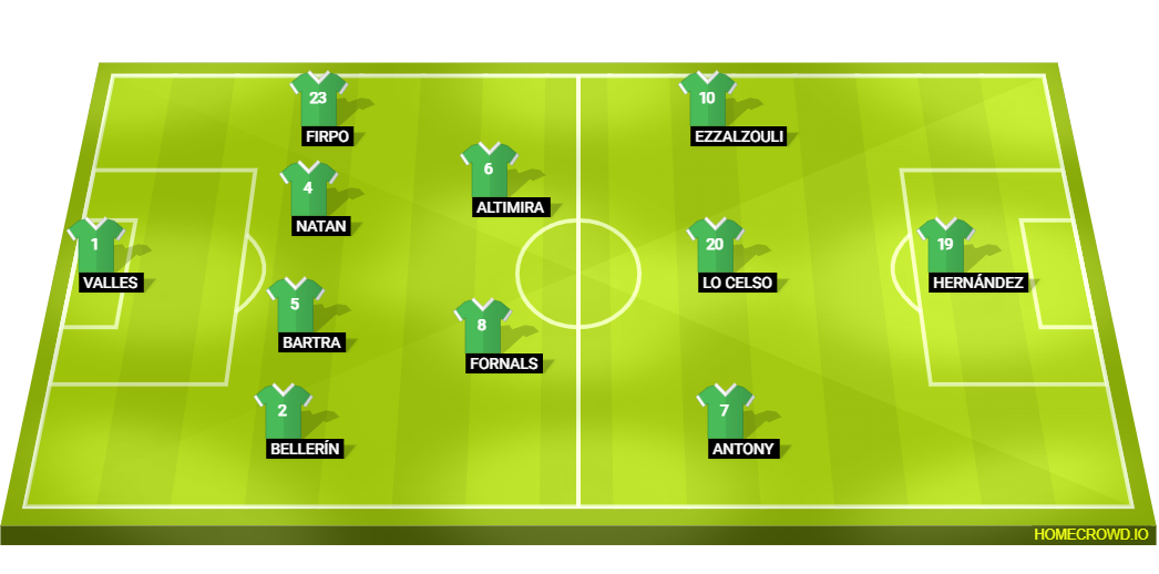 Probable Lineup (4-2-3-1): Valles; Bellerin, Bartra, Natan, Firpo; Fornals, Altimira; Antony, Lo Celso, Ezzalzouli; Cucho