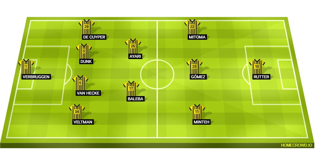 Probable Lineup (4-2-3-1): Verbruggen; Veltman, Dunk, van Hecke, De Cuyper; Baleba, Ayari; Minteh, Diego Gomez, Mitoma; Rutter