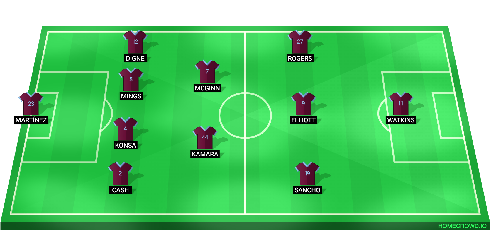 Probable Lineup (4-2-3-1): Martinez, Cash, Konsa, Mings, Digne, Kamara, McGinn, Elliott, Rogers, Sancho, Watkins
