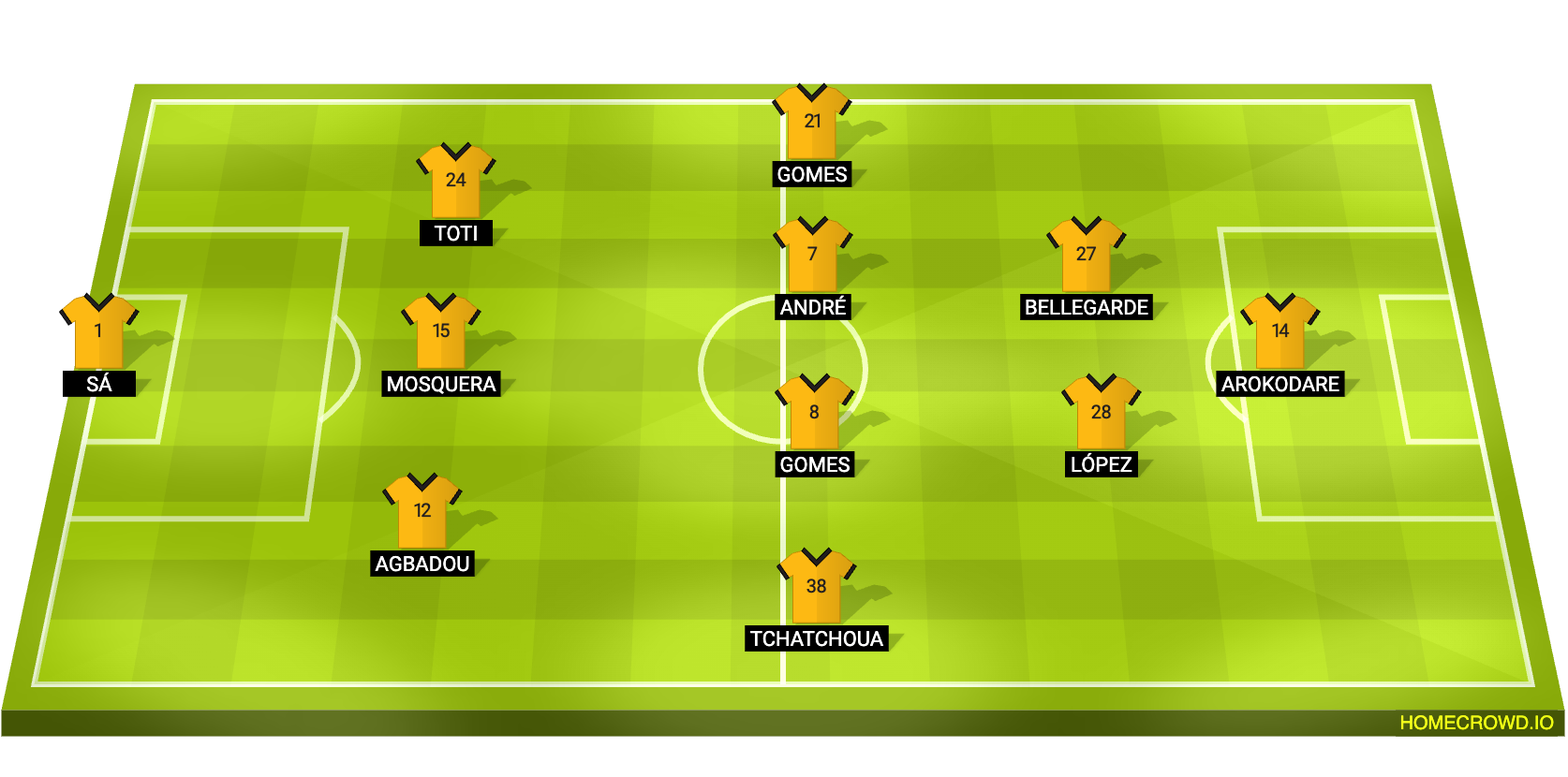 Probable Lineup (3-4-2-1): Jose Sa; Mosquera, Agbadou, Toti; Tchatchoua, J.Gomes, Andre, R.Gomes; Lopez, Bellegarde; Arokodare