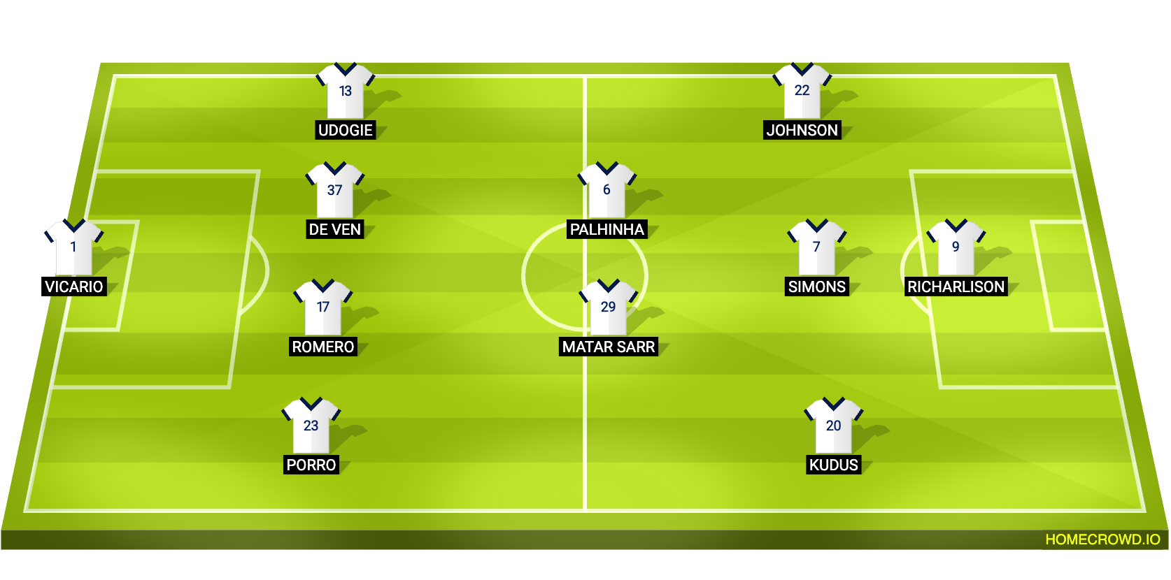 Probable Lineup (4-2-3-1): Vicario; Porro, Romero, Van de Ven, Udogie; Sarr, Palhinha; Kudus, Simons, Johnson; Richarlison