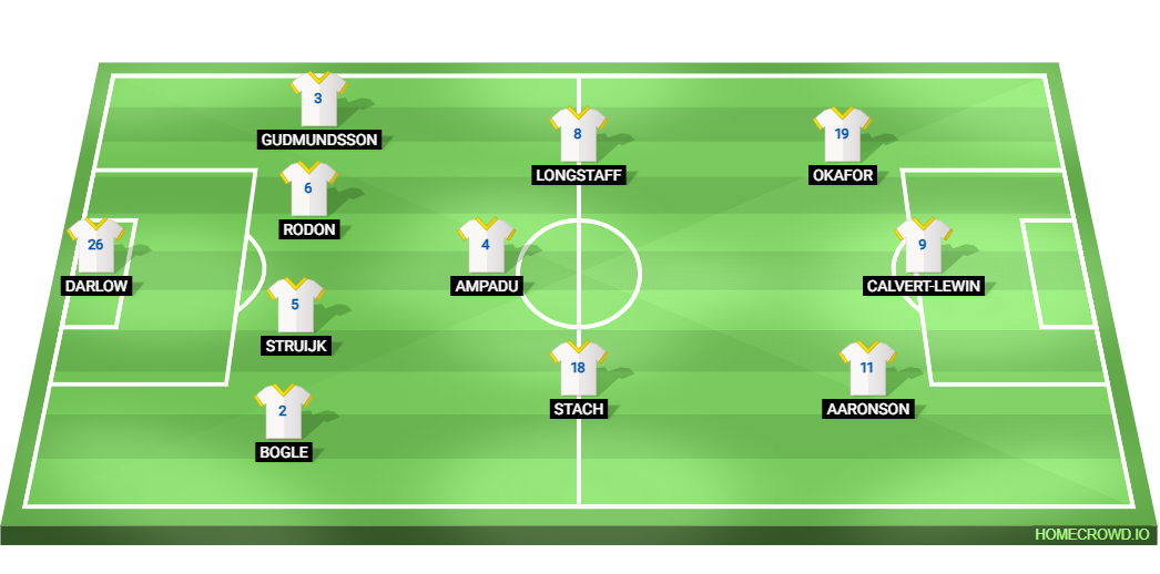 Probable Lineup (4-3-3): Darlow; Bogle, Struijk, Rodon, Gudmundsson; Stach, Ampadu, Longstaff; Aaronson, Calvert-Lewin, Okafor