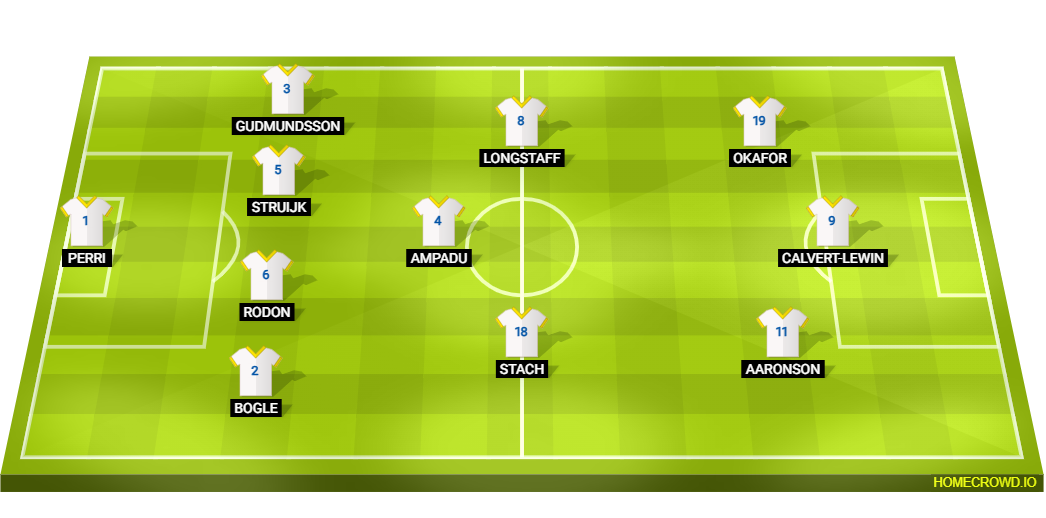 Probable Lineup (4-3-3): Perri; Bogle, Rodon, Struijk, Gudmundsson; Stach, Ampadu, Longstaff; Aaronson, Calvert-Lewin, Okafor