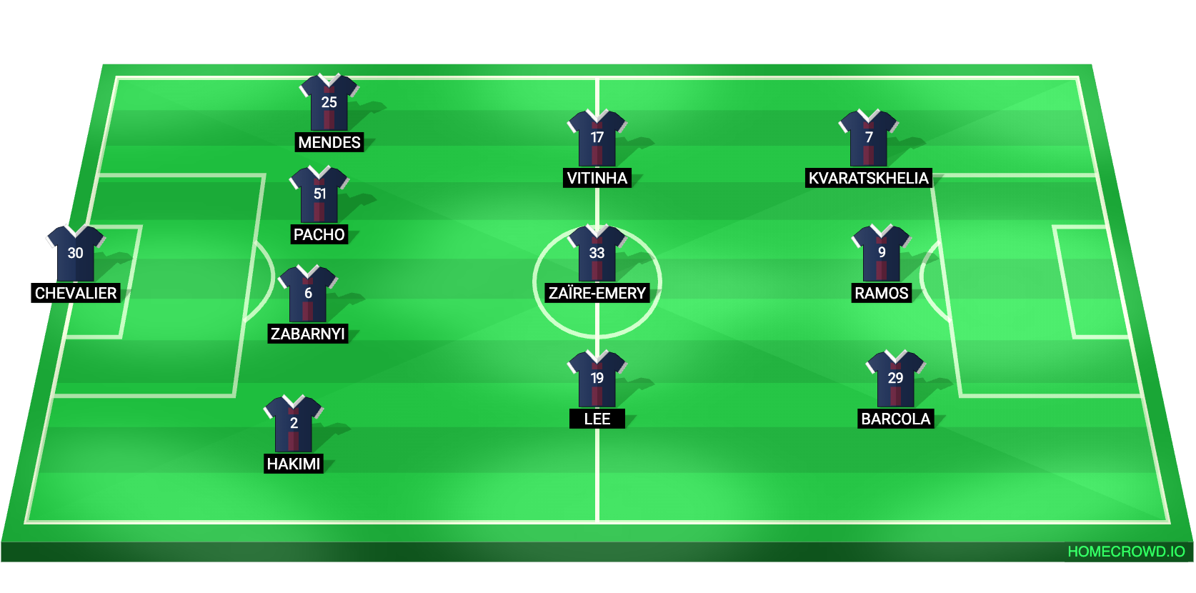 Probable Lineup (4-3-3): Chevalier; Hakimi, Zabarnyi, Pacho, Mendes; Lee, Zaire-Emery, Vitinha; Barcola, Ramos, Kvaratskhelia