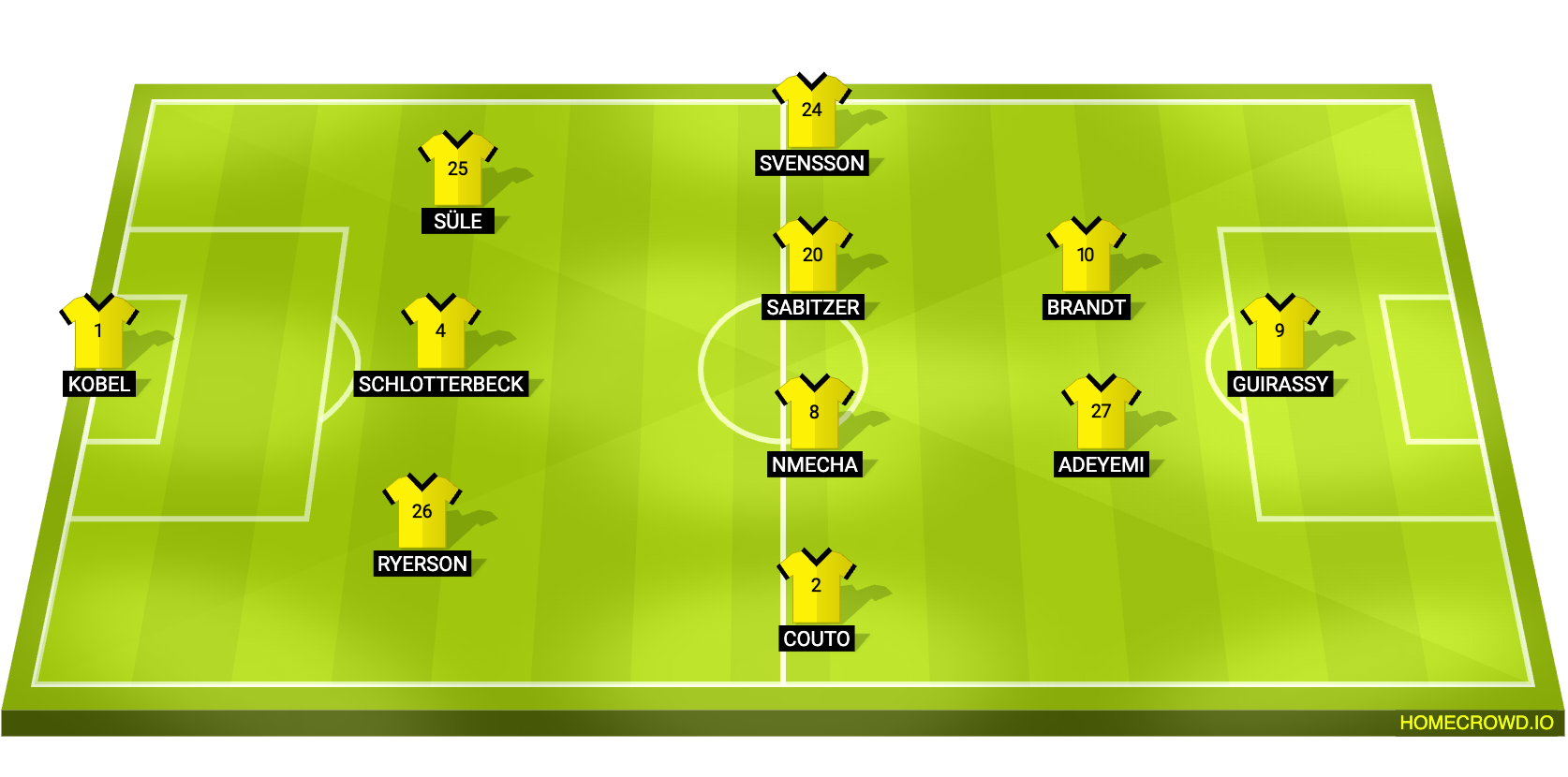 Probable Lineup (3-4-2-1): Kobel; Ryerson, Schlotterbeck, Sule; Couto, Nmecha, Sabitzer, Svensson; Adeyemi, Brandt; Guirassy