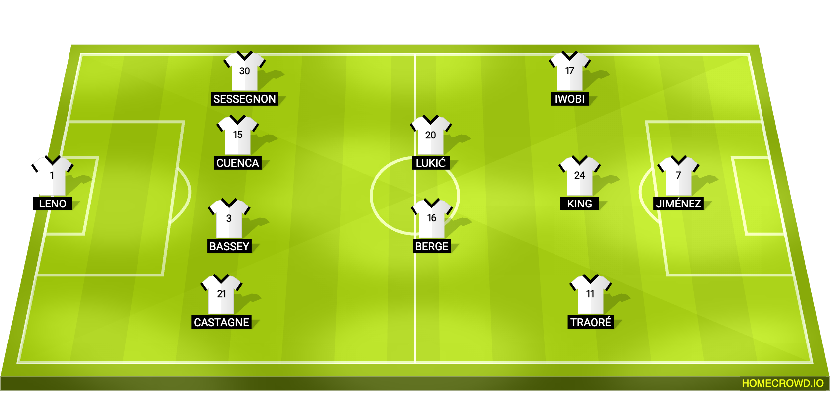 Probable Lineup (4-2-3-1): Leno; Castagne, Cuenca, Bassey, Sessegnon; Berge, Lukic; Traore, King, Iwobi; Jimenez