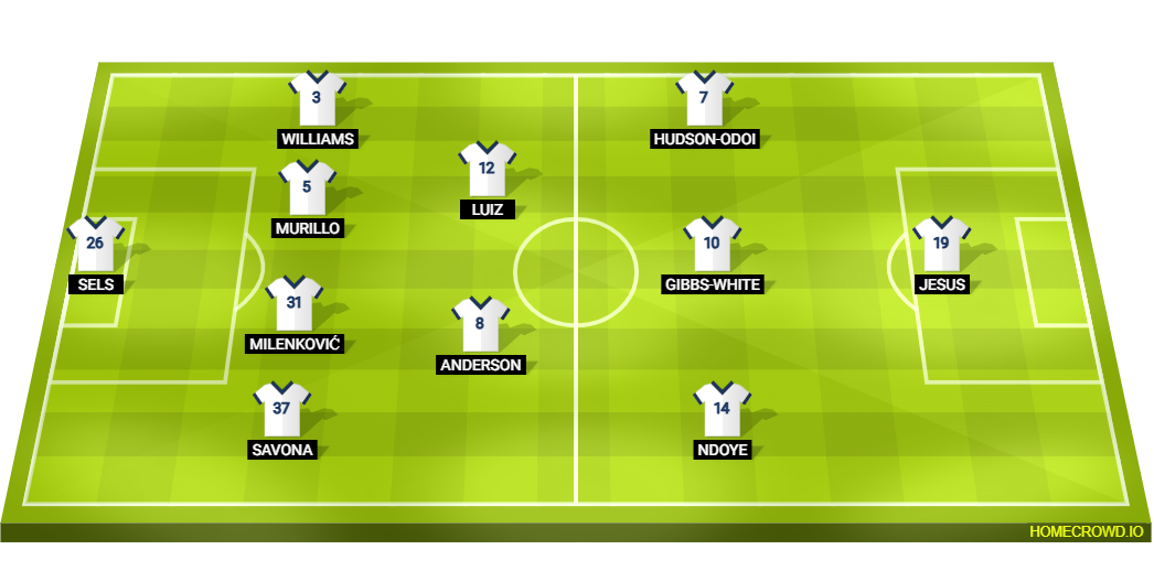 Probable Lineup (4-2-3-1): Sels; Savona, Milenkovic, Murillo, Williams; Anderson, Luiz; Ndoye, Gibbs-White, Hudson-Odoi; Jesus