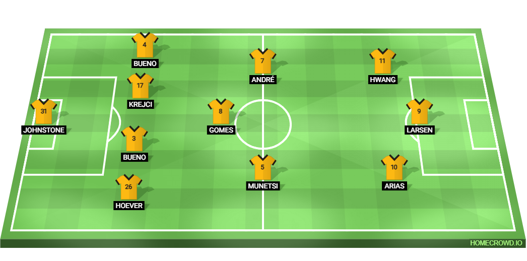 Probable Lineup (4-3-3): Johnstone; Hoever, Santiago Bueno, Krejci, Hugo Bueno; Munetsi, Gomes, Andre; Arias, Larsen, Hwang