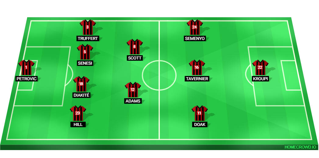 Bournemouth (4-2-3-1): Petrovic, Hill, Diakite, Senesi, Truffert; Adams, Scott; Doak, Tavernier, Semenyo; Kroupi