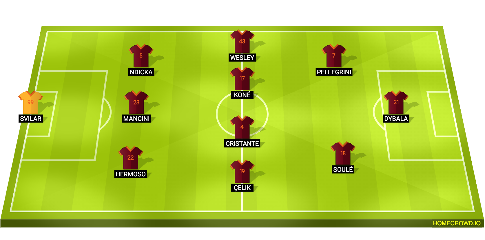 Probable Lineup (3-4-2-1): Svilar; Hermoso, Mancini, Ndicka; Celik, Cristante, Kone, Wesley; Soule, Pellegrini; Dybala