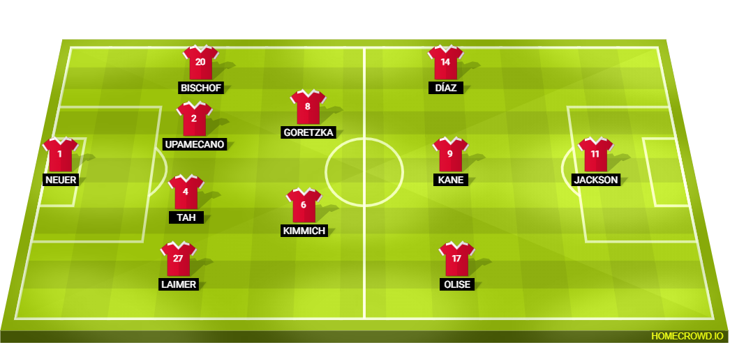 Probable Lineup (4-2-3-1): Neuer; Laimer, Tah, Upamecano, Bischof; Kimmich, Goretzka; Olise, Kane, Diaz; Jackson