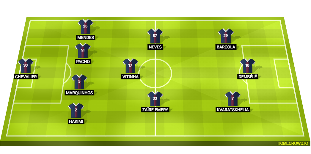 Probable Lineup (4-3-3): Chevalier; Hakimi, Marquinhos, Pacho, Mendes; Zaire-Emery, Vitinha, Neves; Kvaratskhelia, Dembele, Barcola