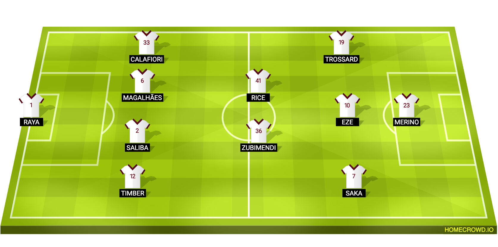 Probable Lineup (4-2-3-1): Raya; Timber, Saliba, Gabriel, Calafiori; Zubimendi, Rice; Saka, Eze, Trossard; Merino