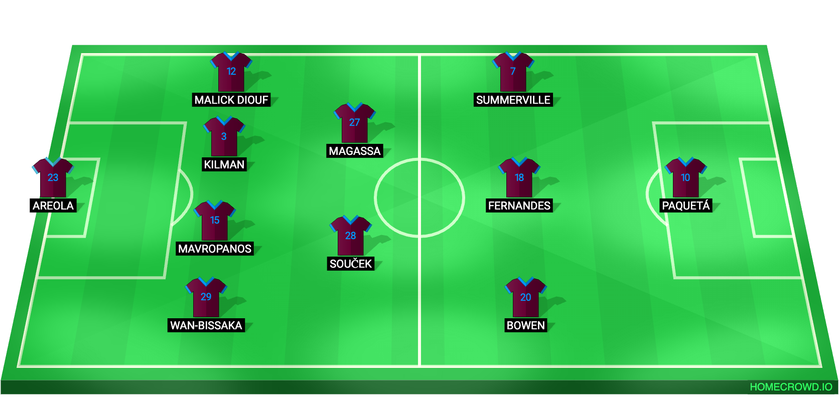 Probable Lineup (4-2-3-1): Areola; Wan-Bissaka, Todibo, Kilman, Diouf; Soucek, Magassa; Bowen, Fernandes, Summerville; Paqueta