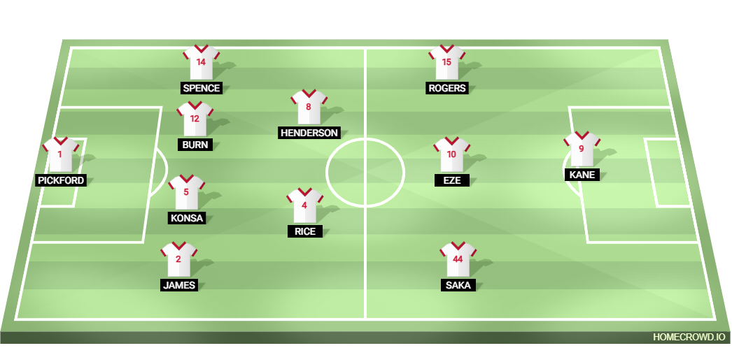 Probable England Lineup (4-2-3-1): Pickford; James, Konsa, Burn, Spence; Rice, Henderson; Saka, Eze, Rogers; Kane