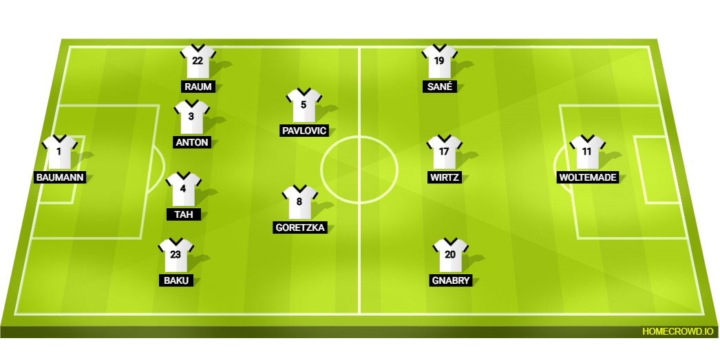 Probable Lineup (4-2-3-1): Baumann; Baku, Tah, Anton, Raum; Goretzka, Pavlovic; Gnabry, Wirtz, Sane; Woltemade