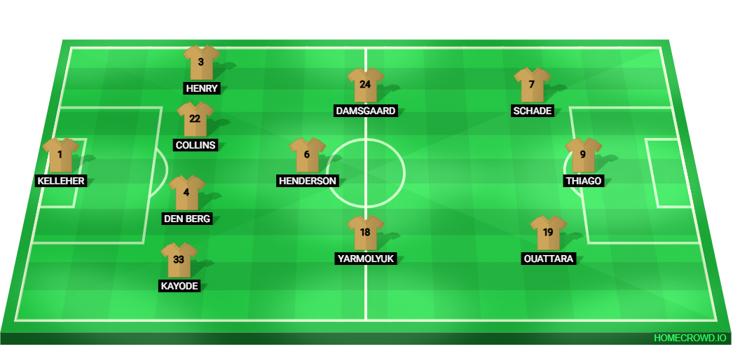 Probable Lineup (4-2-3-1): Kelleher; Kayode, van den Berg, Collins, Henry; Yarmolyuk, Jensen; Ouattara, Damsgaard, Schade; Thiago