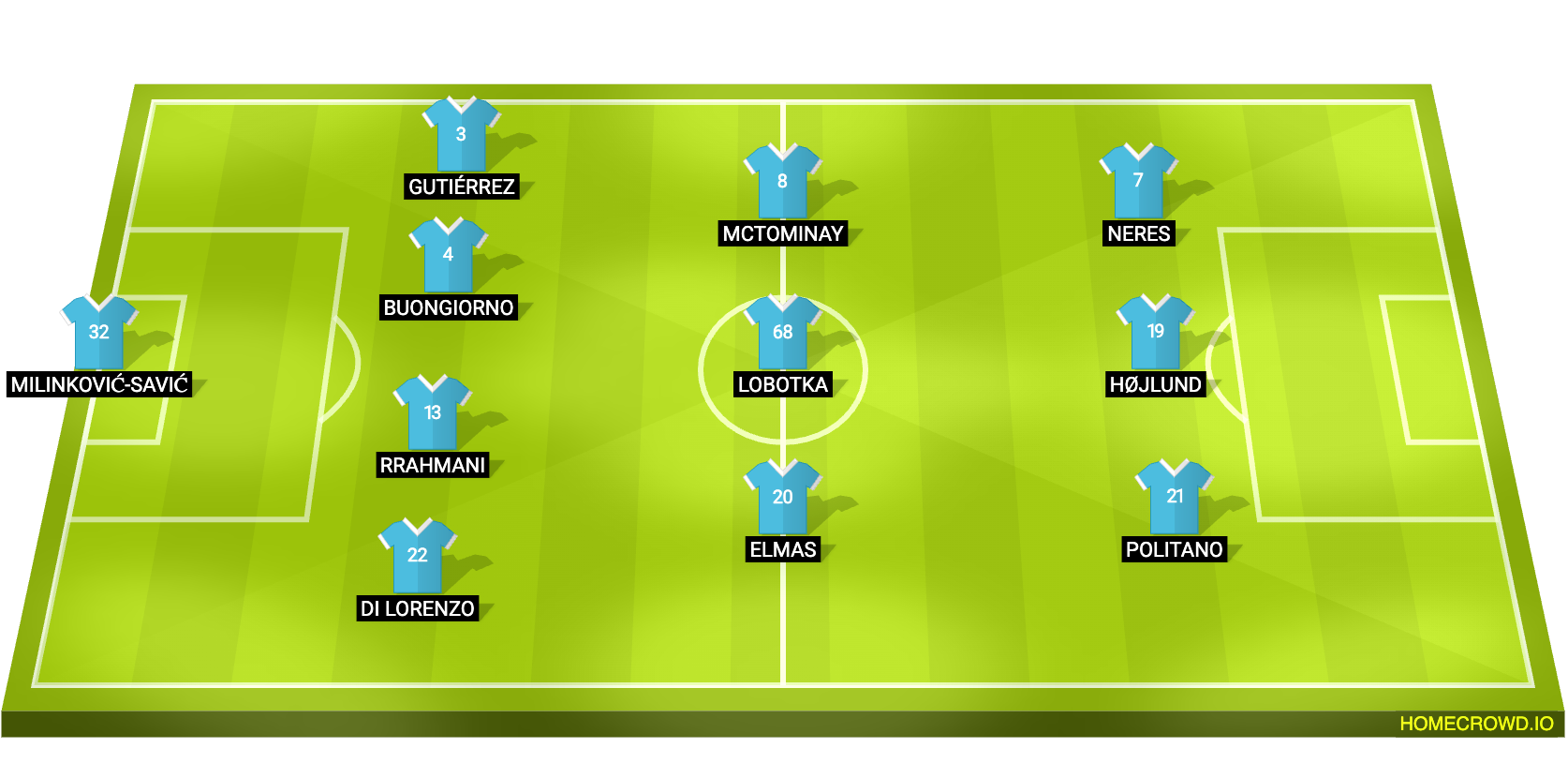 Probable Lineup (4-3-3): Milinkovic-Savic; Di Lorenzo, Rrahmani, Buongiorno, Gutierrez; Elmas, Lobotka, McTominay; Politano, Hojlund, Neres