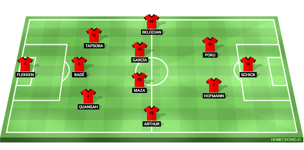 Probable Lineup (3-4-2-1): Flekken; Quansah, Bade, Tapsoba; Arthur, Maza, Garcia, Belocian; Hofmann, Poku; Schick