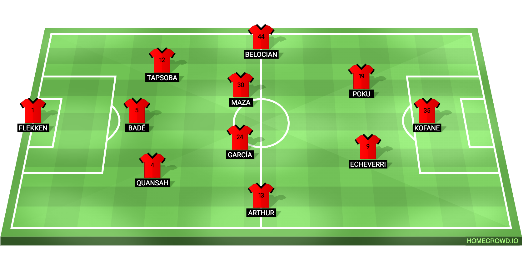 Probable Lineup (3-4-2-1): Flekken; Quansah, Bade, Tapsoba; Arthur, Garcia, Maza, Belocian; Poku, Echeverri; Kofane