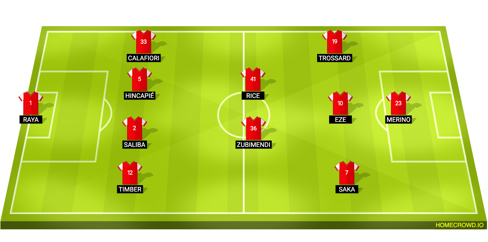 Probable Lineup (4-2-3-1): Raya; Timber, Saliba, Hincapie, Calafiori; Zubimendi, Rice; Saka, Eze, Trossard; Merino