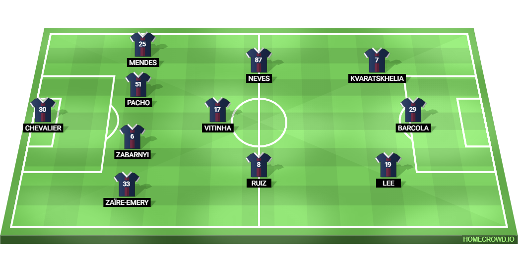 Probable Lineup (4-3-3): Chevalier; Zaire-Emery, Zabarnyi, Pacho, Mendes; Ruiz, Vitinha, Neves; Lee, Barcola, Kvaratskhelia