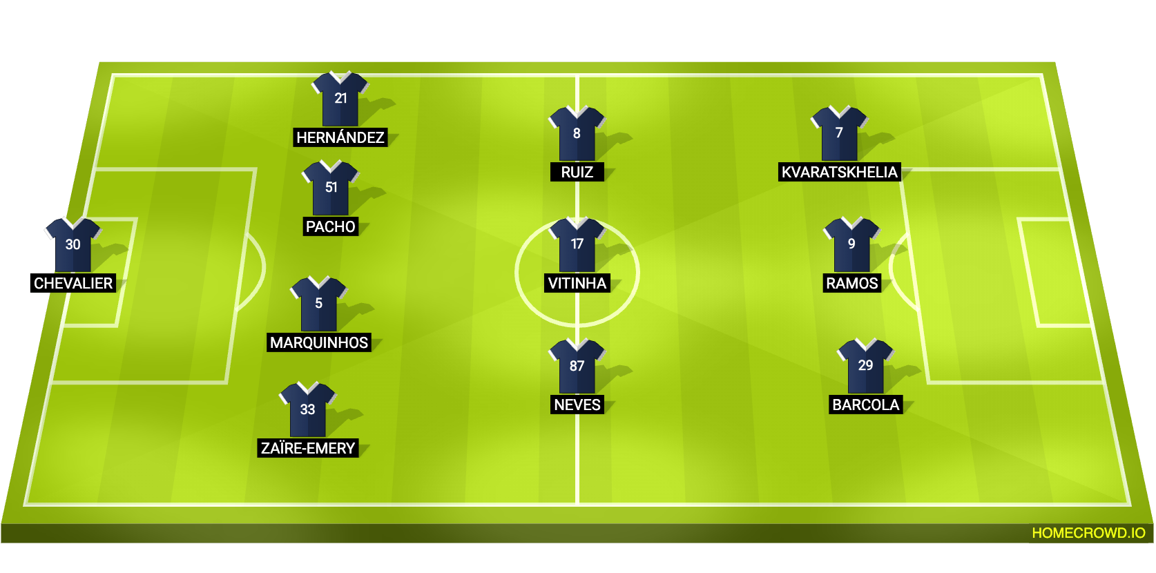 Probable Lineup (4-3-3): Chevalier; Zaire-Emery, Marquinhos, Pacho, Hernandez; Neves, Vitinha, Ruiz; Barcola, Ramos, Kvaratskhelia