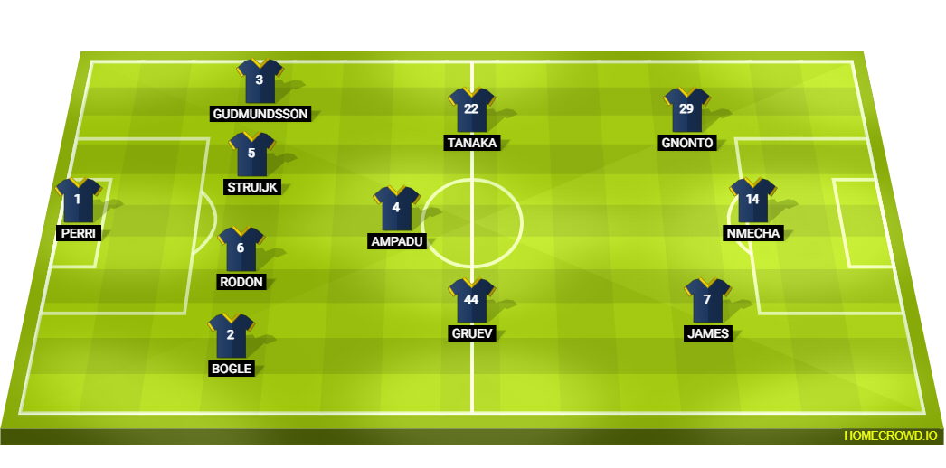 Probable Lineup (4-3-3): Perri; Bogle, Rodon, Struijk, Gudmundsson; Gruev, Ampadu, Tanaka; James, Nmecha, Gnonto