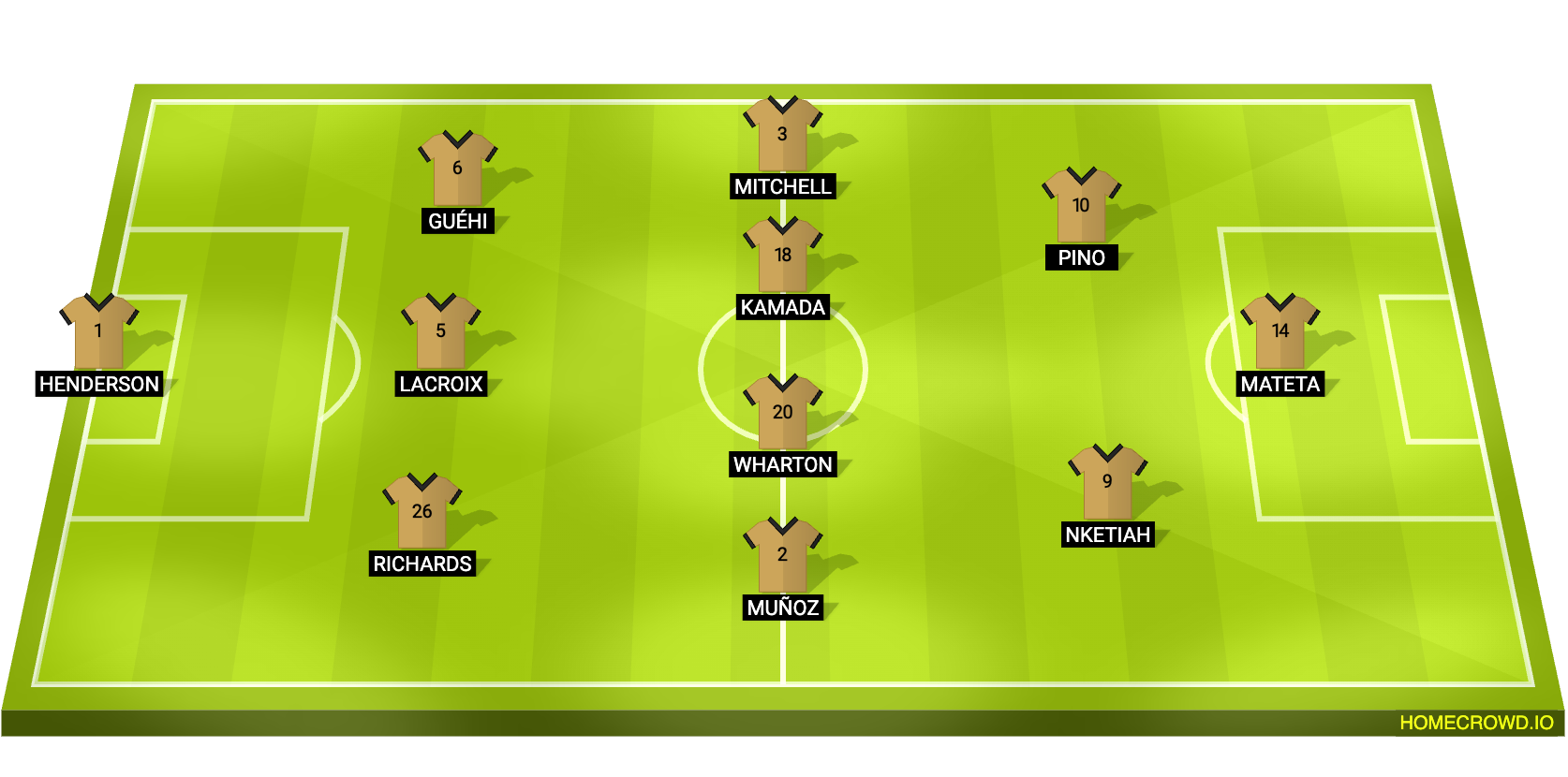 Probable Lineup (3-4-2-1): Henderson; Richards, Lacroix, Guehi; Munoz, Wharton, Kamada, Mitchell; Nketiah, Pino; Mateta