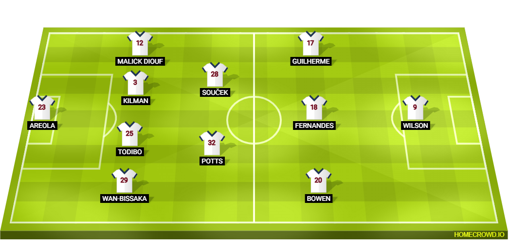 Probable Lineup (4-2-3-1): Areola; Wan-Bissaka, Todibo, Kilman, Diouf; Potts, Soucek; Bowen, Mateus Fernandes, Guilherme; Wilson